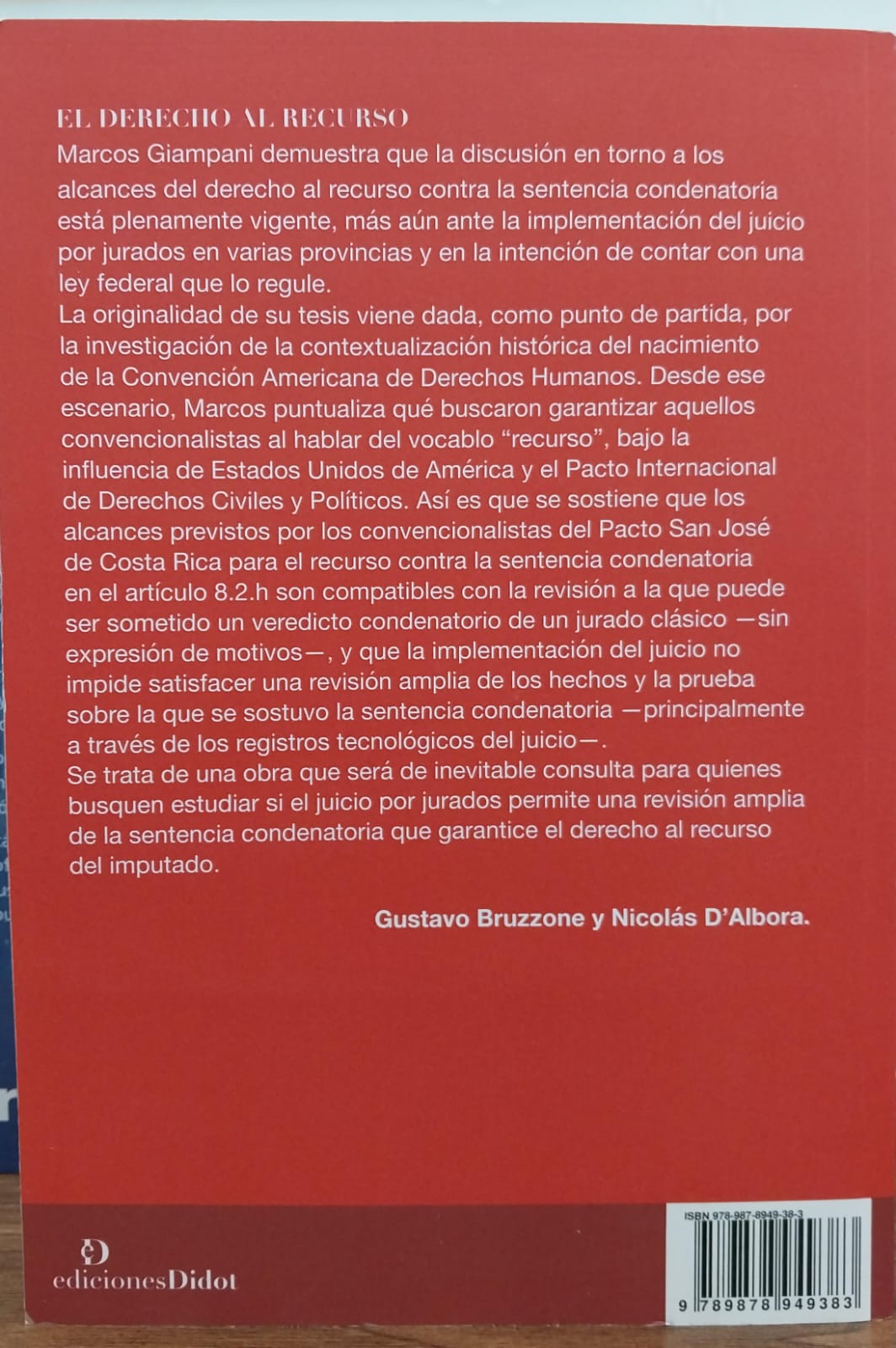 Marcos Giampani demuestra que la discusión en torno a los alcances del derecho al recurso contra la sentencia condenatoria está plenamente vigente, más aún ante la implementación del juicio por jurados en varias provincias y en la intención de contar con una ley federal que lo regule. La originalidad de su tesis viene dada, como punto de partida, por la investigación de la contextualización histórica del nacimiento de la Convención Americana de Derechos Humanos. Desde ese escenario, Marcos puntualiza qué buscaron garantizar aquellos convencionalistas al hablar del vocablo “recurso”, bajo la influencia de Estados Unidos de América y el Pacto Internacional de Derechos Civiles y Políticos. Así es que se sostiene que los alcances previstos por los convencionalistas del Pacto San José de Costa Rica para el recurso contra la sentencia condenatoria en el artículo 8.2.h son compatibles con la revisión a la que puede ser sometido un veredicto condenatorio de un jurado clásico —sin expresión de motivos—, y que la implementación del juicio no impide satisfacer una revisión amplia de los hechos y la prueba sobre la que se sostuvo la sentencia condenatoria —principalmente a través de los registros tecnológicos del juicio—. Se trata de una obra que será de inevitable consulta para quienes busquen estudiar si el juicio por jurados permite una revisión amplia de la sentencia condenatoria que garantice el derecho al recurso del imputado. Gustavo Bruzzone y Nicolás D’Albora.